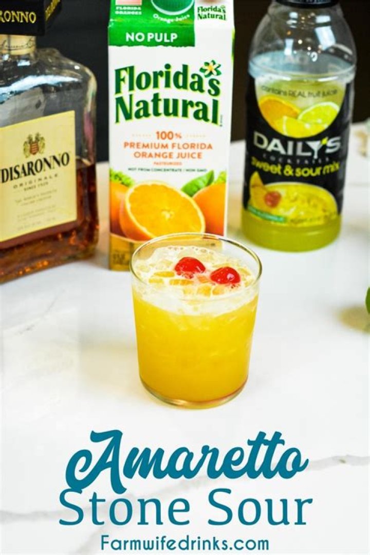 Tartaric acid macaroon. The Amaretto Stone Sour ■■■■■■■■ mixes the amaretto with an acidic blend and orange juice. The result is sweet, bittersweet, with a predominance of citrus and a sweet note that creeps in immediately. It has some sweetness and fullness, but it also has a nice side that makes it interesting.