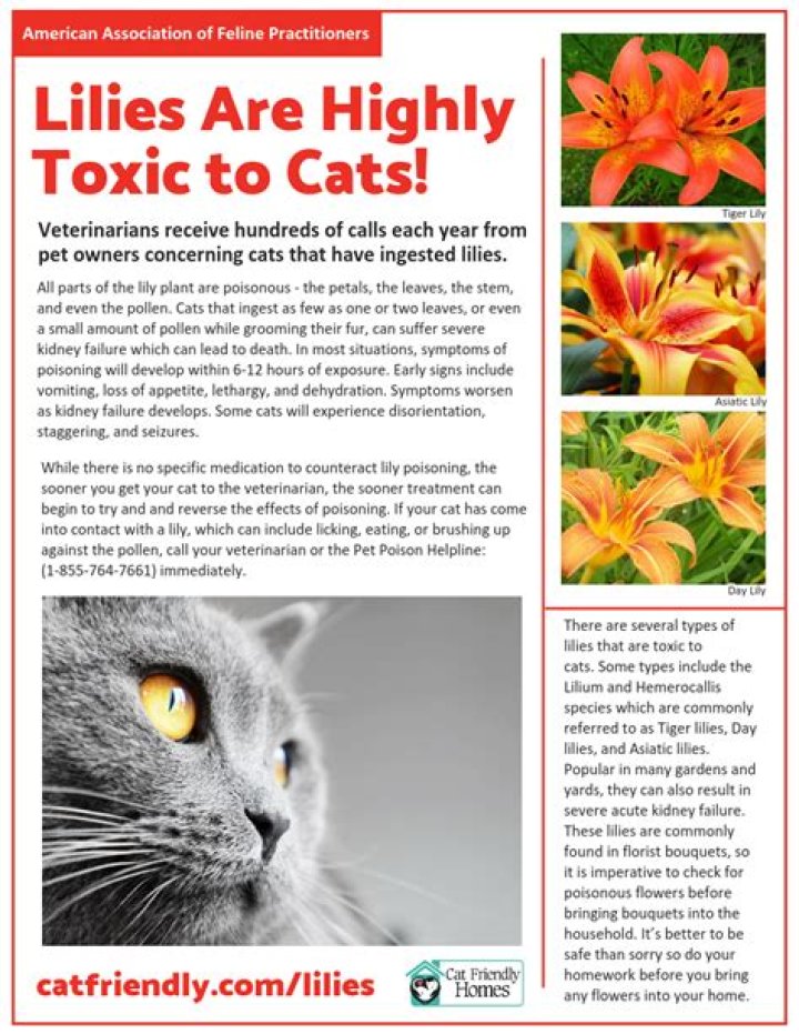 Threat: Just 2-3 leaves, or even the pollen groomed off the fur, can result in poisoning in a cat. If untreated, acute kidney failure will develop and be fatal.