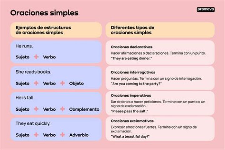 Las oraciones simples son aquellas que contienen un único verbo o perífrasis verbal y, por lo tanto, un único predicado. Una oración como Juan cena pollo con patatas es simple porque solo tiene un verbo (cena) y un predicado (cena pollo con patatas), siendo que el verbo es siempre el núcleo del predicado.