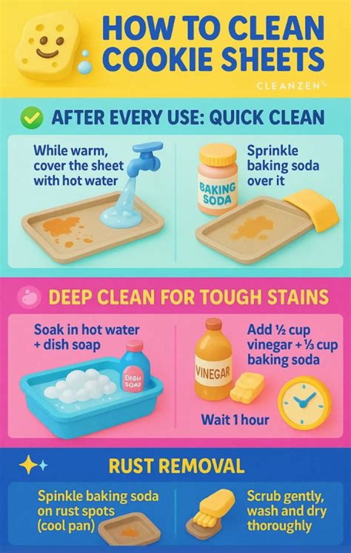 Step 1: Add one part baking soda to two parts white vinegar to form a paste. Step 2: Spread the paste over the baking sheet and let sit for 30 minutes. Step 3: Scrub the mixture away with a damp sponge. Step 4: Rinse the baking sheet and wash with warm soapy water.