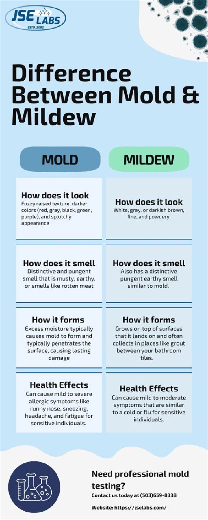 Mildew is typically white, gray or yellow and grows on the surface of moist, warm areas. Its texture is fluffy or powdery. On the other hand, mold tends to be green or black, and it usually grows underneath the surface of anything that has gotten wet.