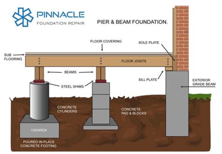 A true pier and beam foundation consists of pedestals (piers) embedded into the ground and spaced at an average of 5 to 6 feet on center with wood beams supporting the floor joists.