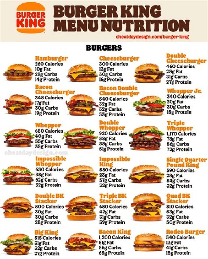 The Bacon King contains a whopping 1,150 calories, with 31 grams of saturated fat and 49 grams of carbohydrates.