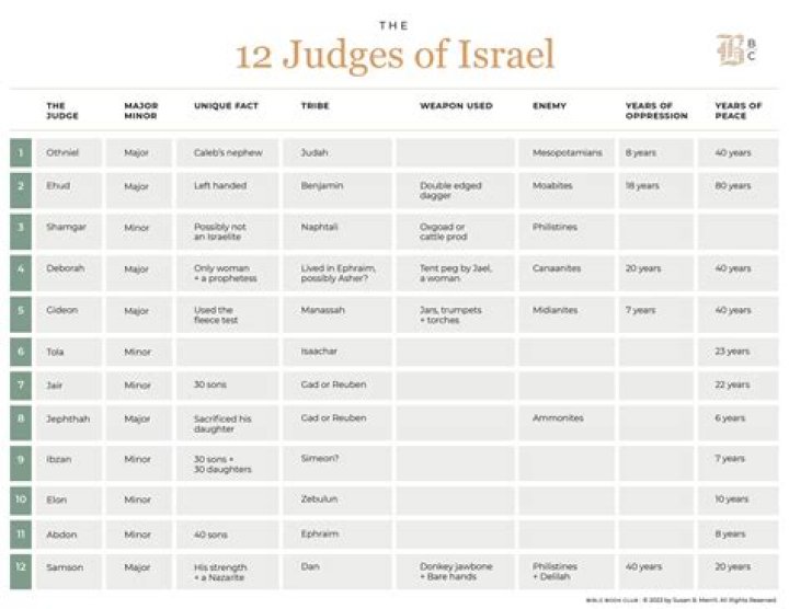 Judges mentioned in the Hebrew Bible The Book of Judges mentions twelve leaders who are said to “judge” Israel: Othniel, Ehud, Shamgar, Deborah, Gideon, Tola, Jair, Jephthah, Ibzan, Elon, Abdon, and Samson.