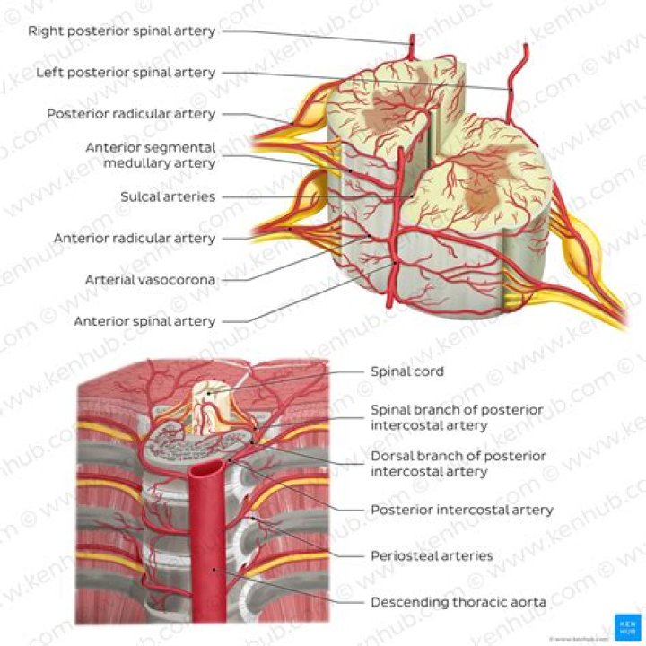 The vertebral artery[1] vascularizes the cervical spinal cord, the thoracic vertebral artery[2] vascularizes the first thoracic segments, the dorsal branches of the intercostal arteries[3] vascularize the rest of the thoracic spinal segments, and the lumbar arteries[4] vascularize the lumbosacral spinal cord.
