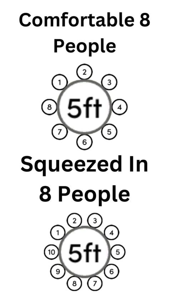 Seating Capacity for TablesTable SizeNumber of People72 inch Round (6′)Seats 10 – 12 Adults60 inch Round (5′)Seats 8 – 10 Adults48 inch Round (4′)Seats 6 – 8 Adults