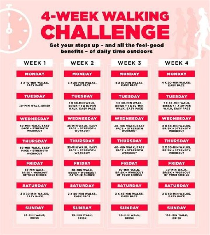Set a goal to walk for 30 minutes a day for the first week and increase it by 10 minutes a day each week. So walk 40 minutes a day for the second week. During the third week, walk for 50 minutes a day. Keep an eye on your calorie intake to make sure your diet reflects your new lifestyle.