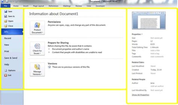 Backstage view is available by clicking the File tab at the top of the program window. Backstage view provides access to information about archiving, opening and opening files (permissions, shares and versions), creating a new file, printing, and recently opened files.