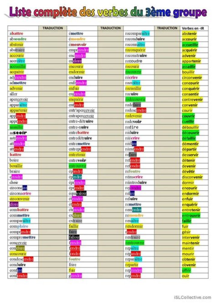 Les verbes du 3e groupe. Ces verbes sont presque tous irréguliers. Ils comprennent les verbes en « ir » dont le participe présent n’est pas en « issant » et les verbes en « oir » et « re ». Dans beaucoup de ces verbes, le radical peut être modifié.