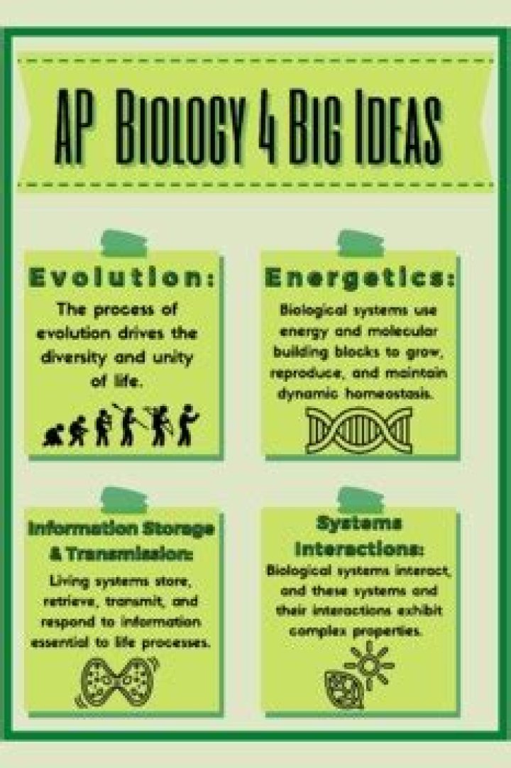 AP Biology is centered around four Big Ideas (Evolution, Energy Processes, Information, and Interactions) as described in the Curriculum Framework outlined by College Board. These Big Ideas encompass the core scientific principles, theories, and processes that govern living organisms and biological systems.