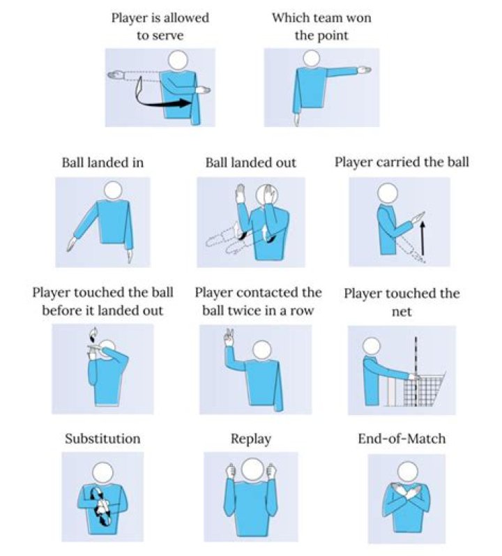 Move the hand to indicate the direction of service.Extend the arm to the side of the team that will serve.Raise eight fingers, spread open.Raise both arms vertically, palms forward.Make a circular motion with the forefinger.Point the arm and fingers toward the floor.