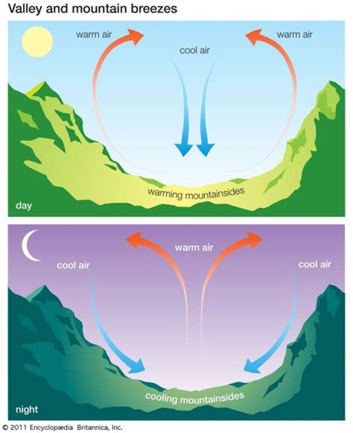 When the valley floor warms during the day, warm air rises up the slopes of surrounding mountains and hills to create a valley breeze. At night, denser cool air slides down the slopes to settle in the valley, producing a mountain breeze. Encyclopædia Britannica, Inc.