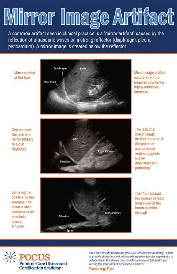 Mirror artifacts occur when there is a strong difference in tissue velocity. When reflective echoes bounce back and forth, the structure is flipped. Mirror artifacts are friendly artifacts that let us exclude pleural effusion because of the reflection of the liver’s image through the diaphragm.