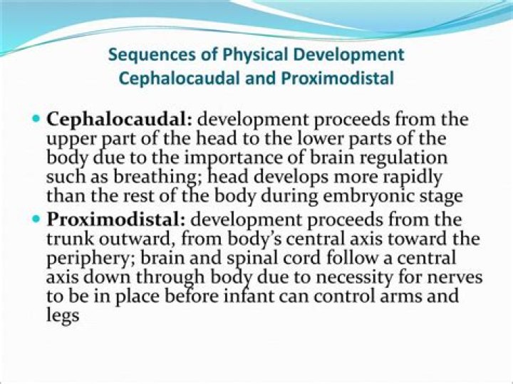 The cephalocaudal trend, or cephalocaudal gradient of growth, refers to the pattern of changing spatial proportions over time during growth. … The proximodistal trend, on the other hand, is the prenatal growth from 5 months to birth when the fetus grows from the inside of the body outwards.