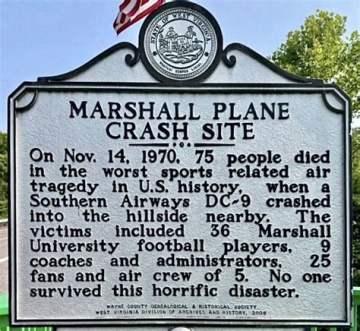 On November 14, 1970, a chartered jet carrying most of the Marshall University football team clips a stand of trees and crashes into a hillside just two miles from the Tri-State Airport in Kenova, West Virginia, killing everyone onboard.