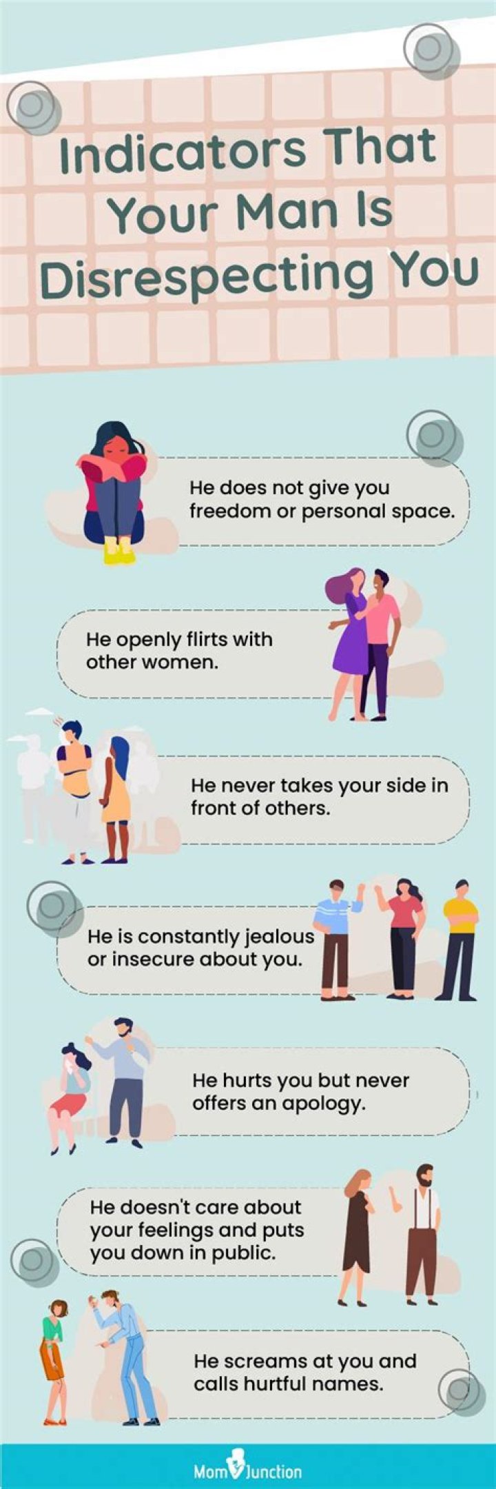 Not making a note of your needs He should make a note of your needs and should try to fulfill it, like the way you do for him. If he is not paying attention to your needs and comfort, he isn’t treating you right. This is the sign of disrespect in marriage.