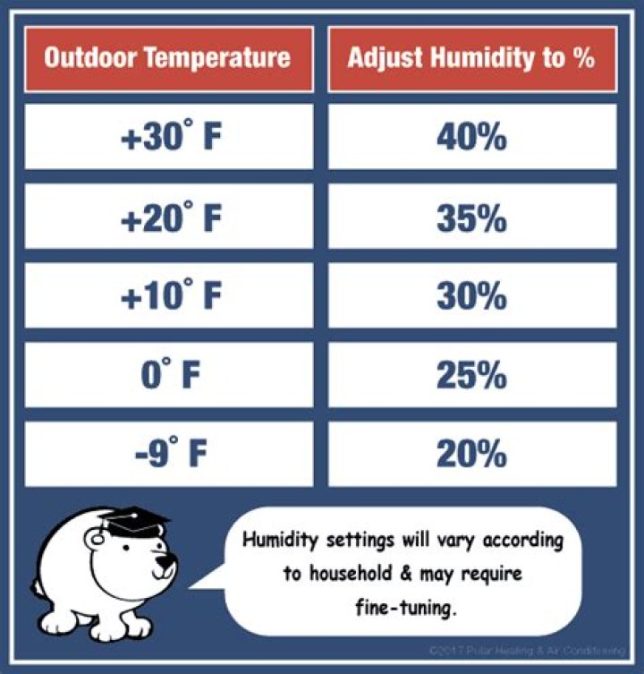 If outside temperature is 0 to 10 degrees, humidity indoors should not be more than 30 percent. If outside temperature is 10-below to 0, humidity indoors should not be more than 25 percent. If outside temperature is 20-below to 10-below, humidity indoors should not be more than 20 percent.