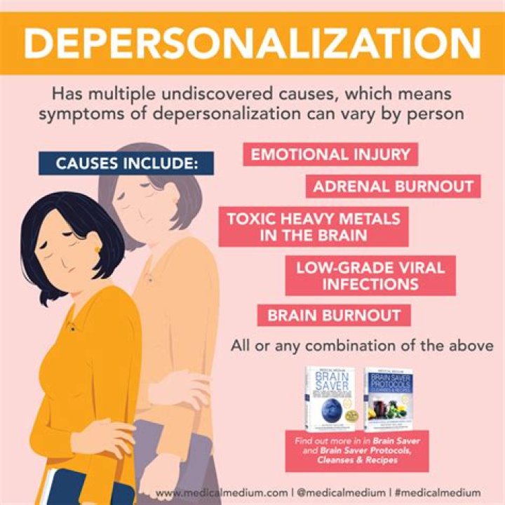 Depersonalization is specifically a sense of detachment from oneself and one’s identity. Derealization is when things or people around seem unreal.