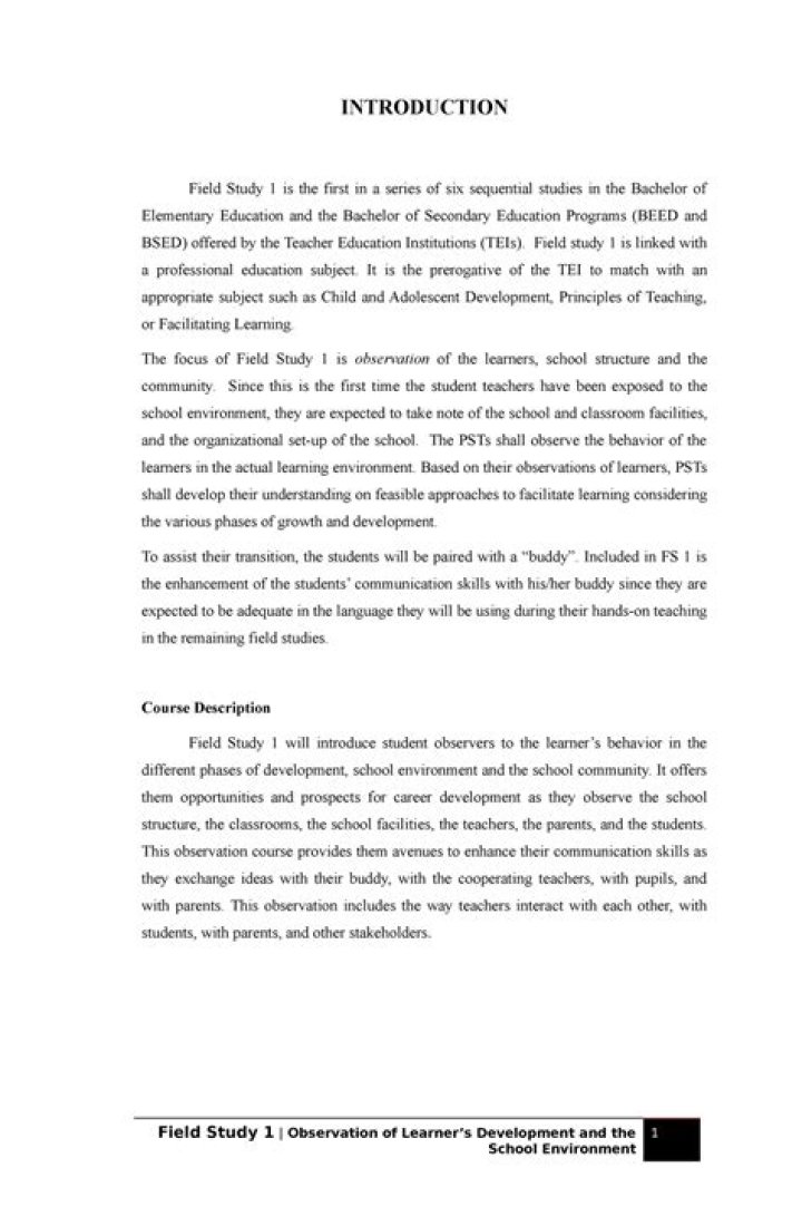 The focus of Field Study 1 is observation of the learners, school structure and the. community. Since this is the first time the student teachers have been exposed to the. school environment, they are expected to take note of the school and classroom facilities, and the organizational set-up of the school.