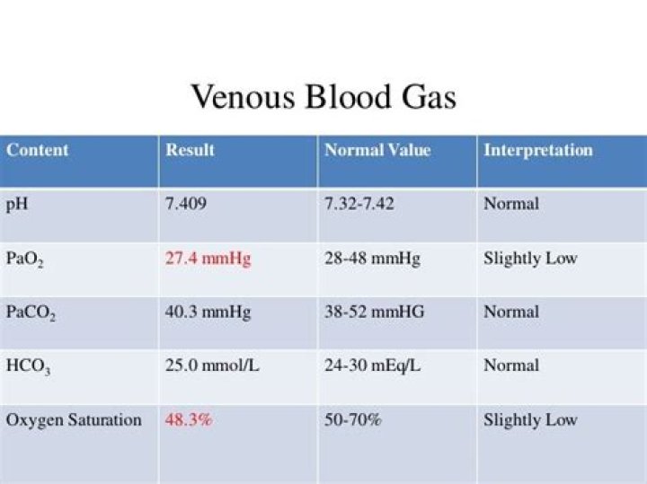 ArterialVenouspH7.35-7.457.31-7.41pCO2 (kPa)4.7 – 6.05.5 – 6.8pCO2 (mmHg)35 -4541 – 51Bicarbonate (mmol/L)22-2823-29