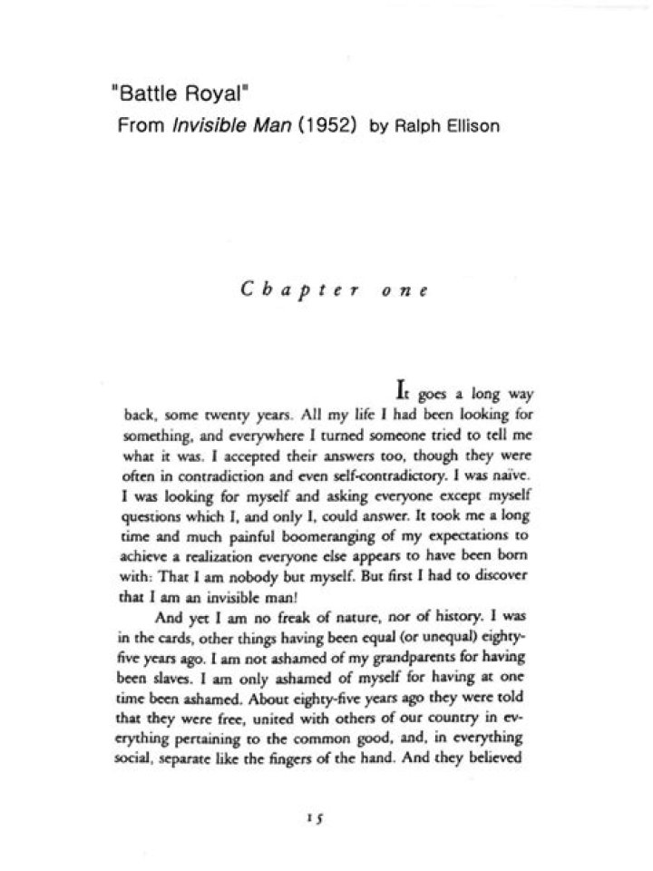 “Battle Royal,” the first chapter of Ralph Ellison’s novel Invisible Man, is about a young black man who participates in a staged brawl for the entertainment of rich white men. The narrator is invited to a party, where he is blindfolded and forced to fight other boys from his school.