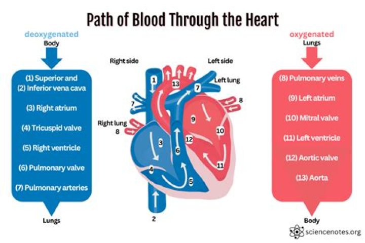 In summary from the video, in 14 steps, blood flows through the heart in the following order: 1) body –> 2) inferior/superior vena cava –> 3) right atrium –> 4) tricuspid valve –> 5) right ventricle –> 6) pulmonary arteries –> 7) lungs –> 8) pulmonary veins –> 9) left atrium –> 10) mitral or bicuspid valve –> 11) left …