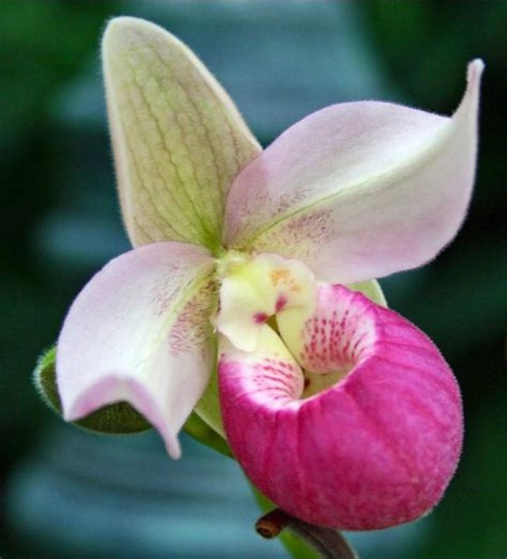 General description: A brightly-colored orchid that has one or sometimes two blossoms on a single stem. White petals sit on top of a white pouch (slipper) streaked with pink. Hairy oval leaves clasp the stem. Length: one to two feet tall.