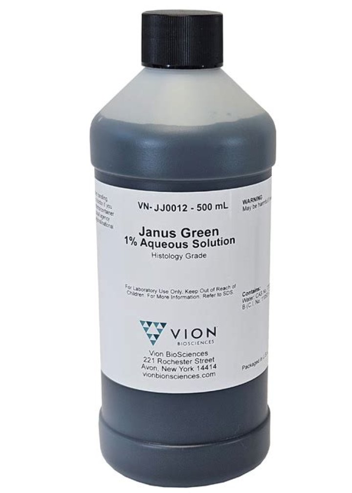 Janus Green B is a basic dye and vital stain used in histology. It is also used to stain mitochondria supravitally, as was introduced by Leonor Michaelis in 1900. The indicator Janus Green B changes colour according to the amount of oxygen present. When oxygen is present, the indicator oxidizes to a blue colour.