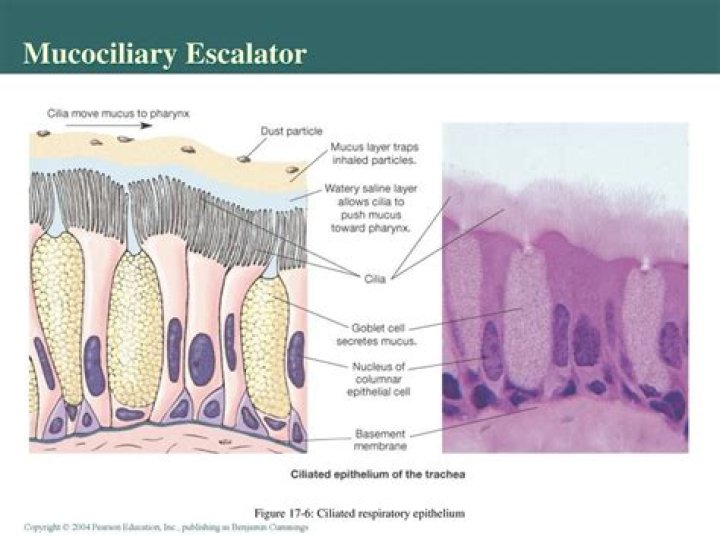 The mucociliary escalator is inside of the conducting airways and is made up of mucus and cilia, which moves the mucus up and out of the lungs where it can be expelled by coughing or swallowing (Figures 1, 2) [5].What is mucociliary clearance and how does it work?