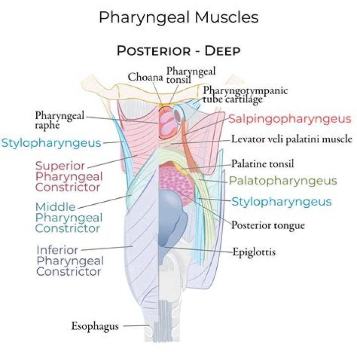 The pharyngeal muscles are a group of muscles that form the pharynx, which is posterior to the oral cavity, determining the shape of its lumen, and affecting its sound properties as the primary resonating cavity. The pharyngeal muscles (involuntary skeletal) push food into the esophagus.
