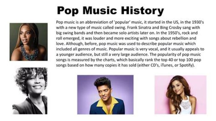 Pop music is a combination of musical genres or types. It originated with the ragtime of the 1890s and early 1900s, the jazz era of the 1920s and 1930s, and the big band era of the 1940s. … Other pop artists include Justin Bieber, Mariah Carey, Whitney Houston, Madonna, Katy Perry, and Taylor Swift.