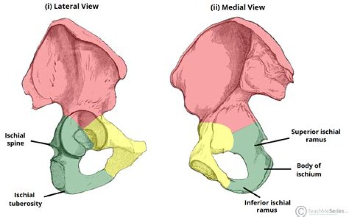 The ischial tuberosity is a rounded bone that extends from the ischium — the curved bone that makes up the bottom of your pelvis. It’s located just below the ischial spine, which is a pointed bone that extends up the backside of your pelvis.