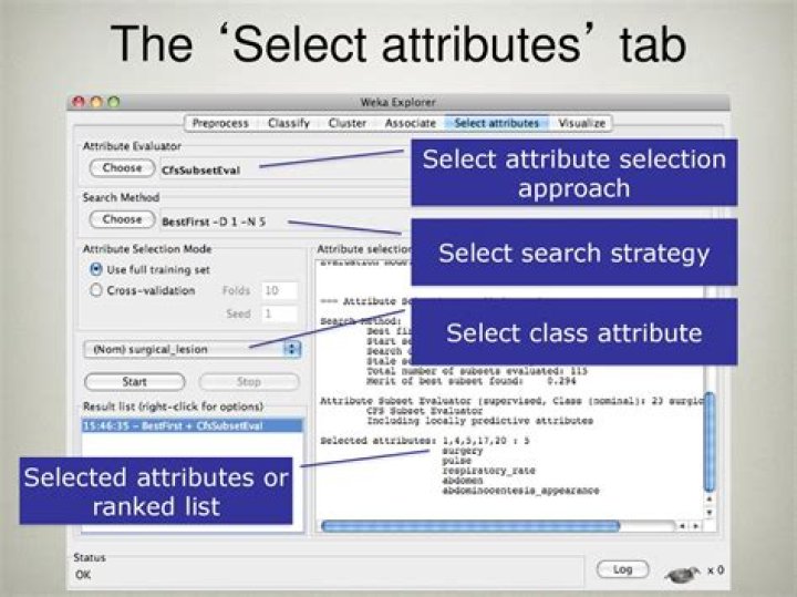 The first Select Attributes Operator selects a subset of the Attributes. The subset is specified by the attributes parameter. The original output port is connected to the input port of the second Select Attributes Operator. There only nominal Attributes are selected.