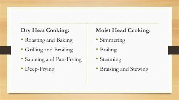 Moist-heat cooking methods use water, liquid or steam to transfer heat to food. Common moist-heat cooking methods include: poaching, simmering, boiling, braising, stewing, pot roasting, steaming and en papillote. Dry-heat cooking methods involve the circulation of hot air or direct contact to fat to transfer heat.