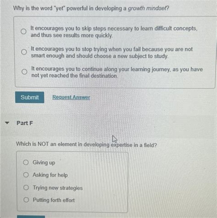 Which is NOT an element in developing expertise in a field? ANSWER: Trying new strategies Putting forth effort Asking for help Giving up How do people with a growth mindset view and respond to challenges? ANSWER: They see challenges as a waste of effort and are embarrassed.